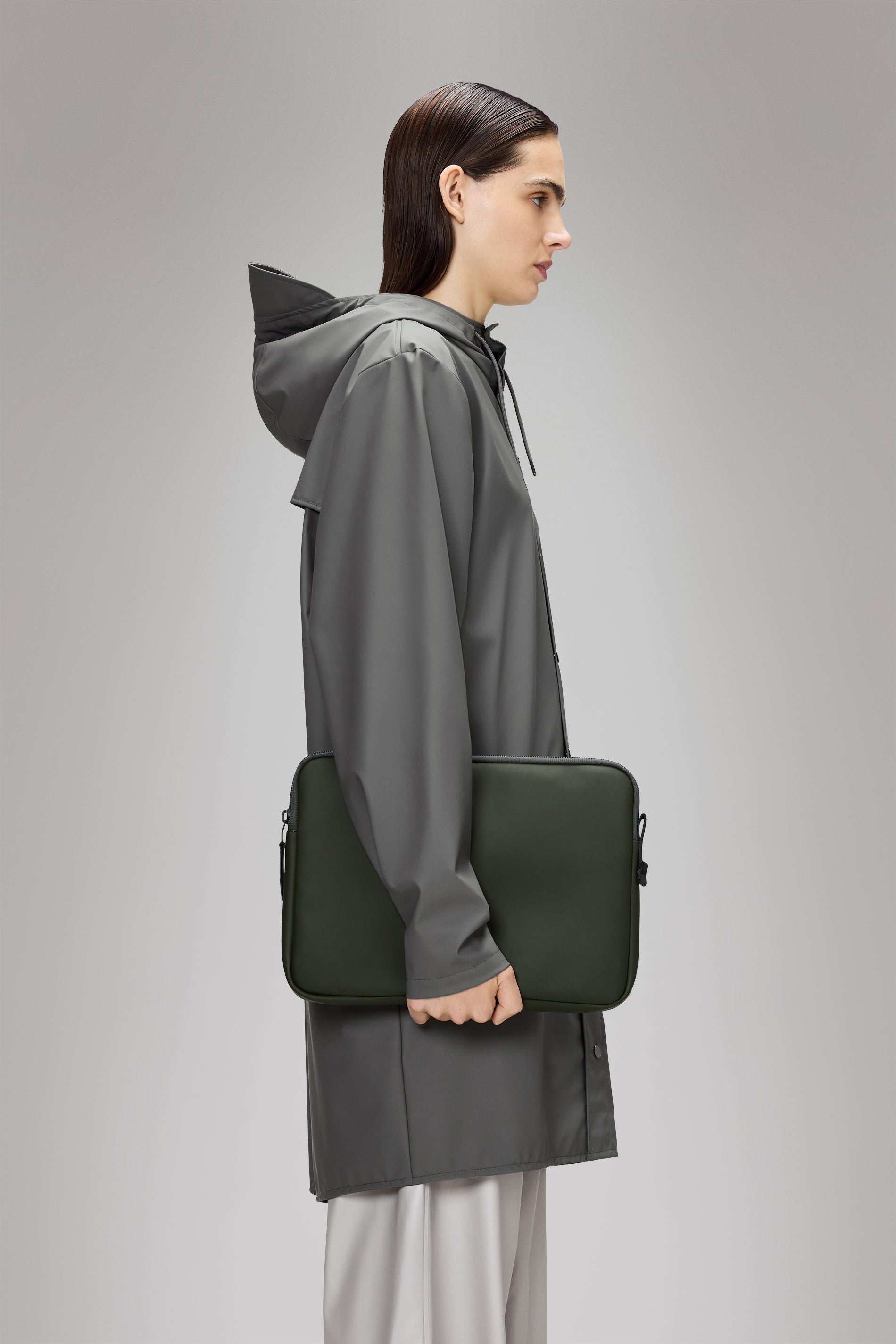 Etuiet, som passer perfekt til 14" laptops, er fremstillet i Rains' vandtætte signatur PU-materiale med beskyttende polstring. Designet omfatter en robust, jacquardvævet strop med logo samt blødt for i mikrofiber, som gør det nemt at tage din enhed ind og ud.