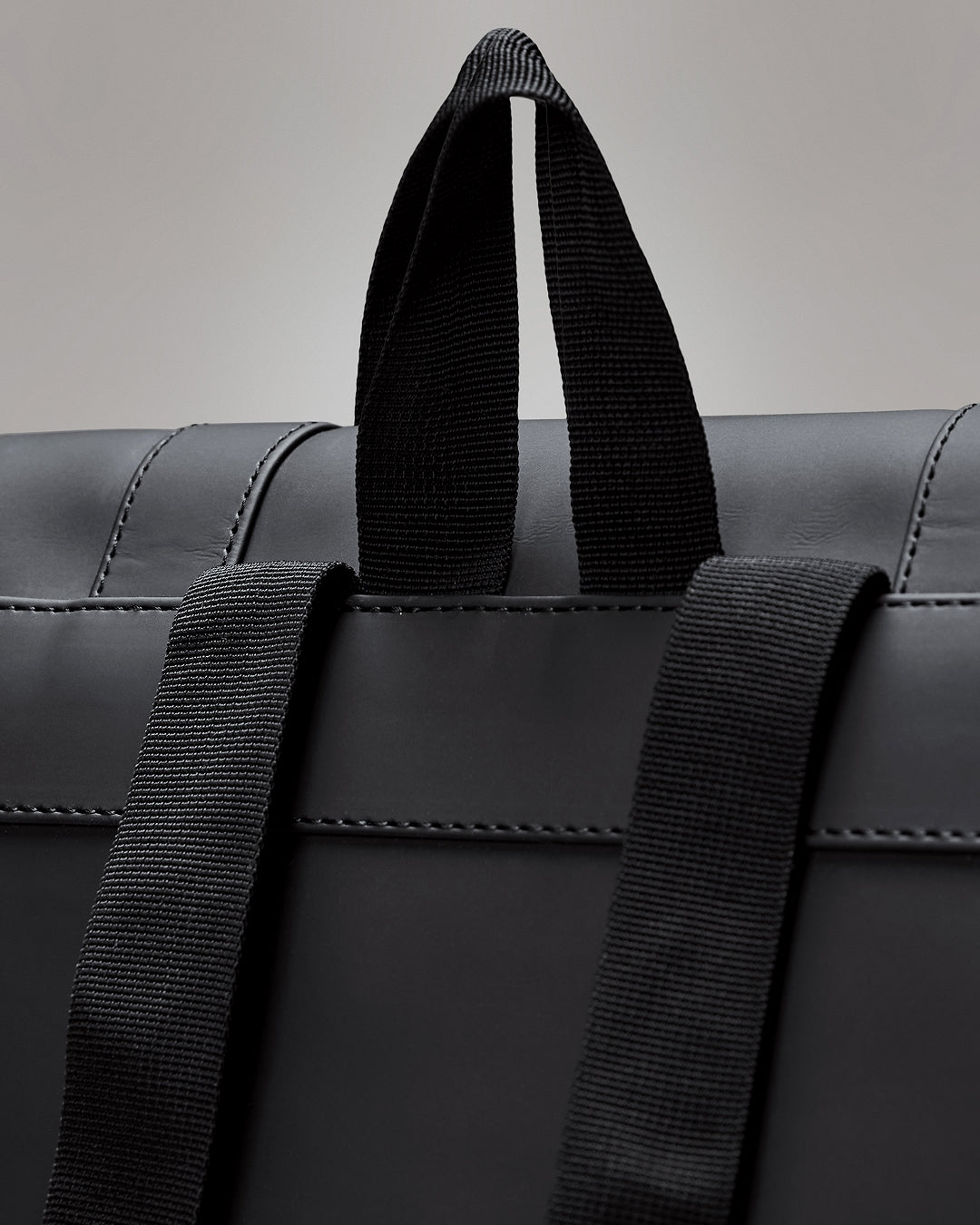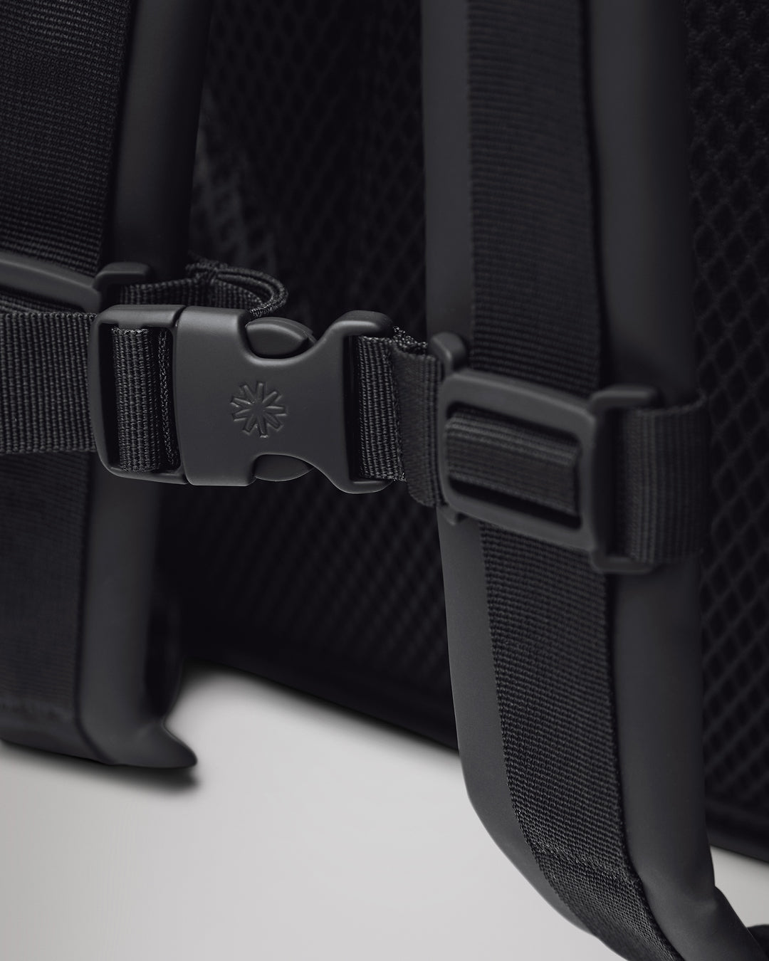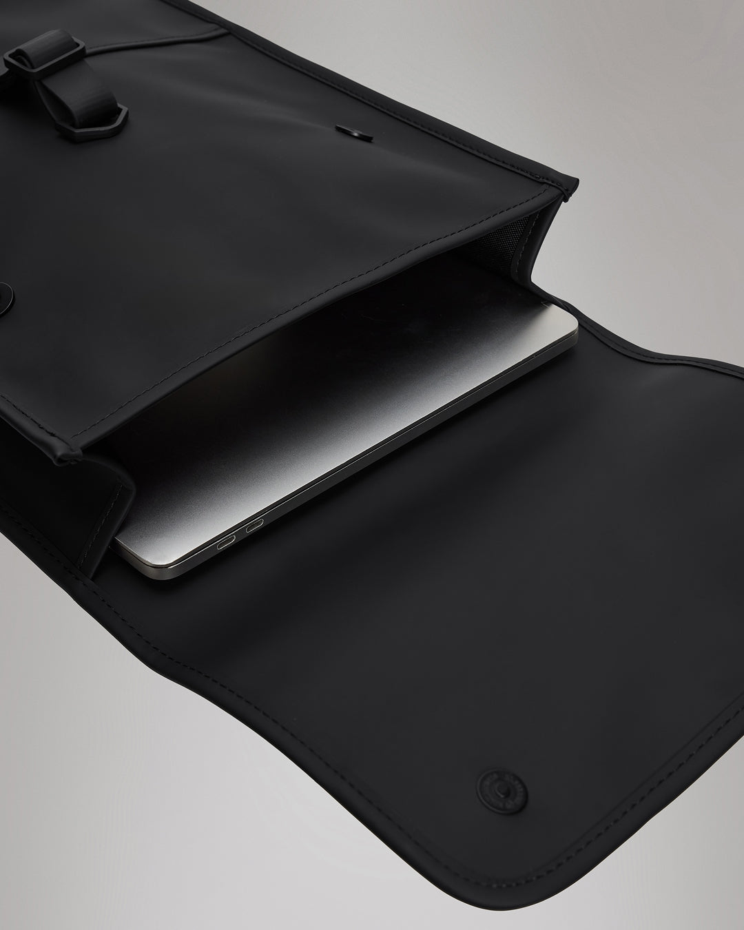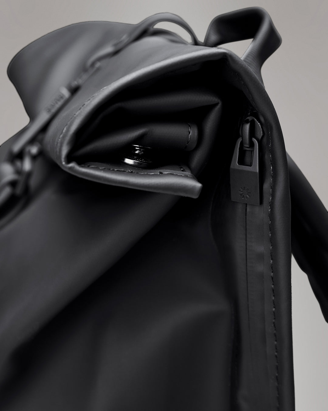 The iconic silhouette, clean, easy-to-wear and always contemporary. Rains’ first backpack design features a squared shape and minimal embellishments. Inside, you’ll find a spacious compartment with room for up to a 15” laptop.