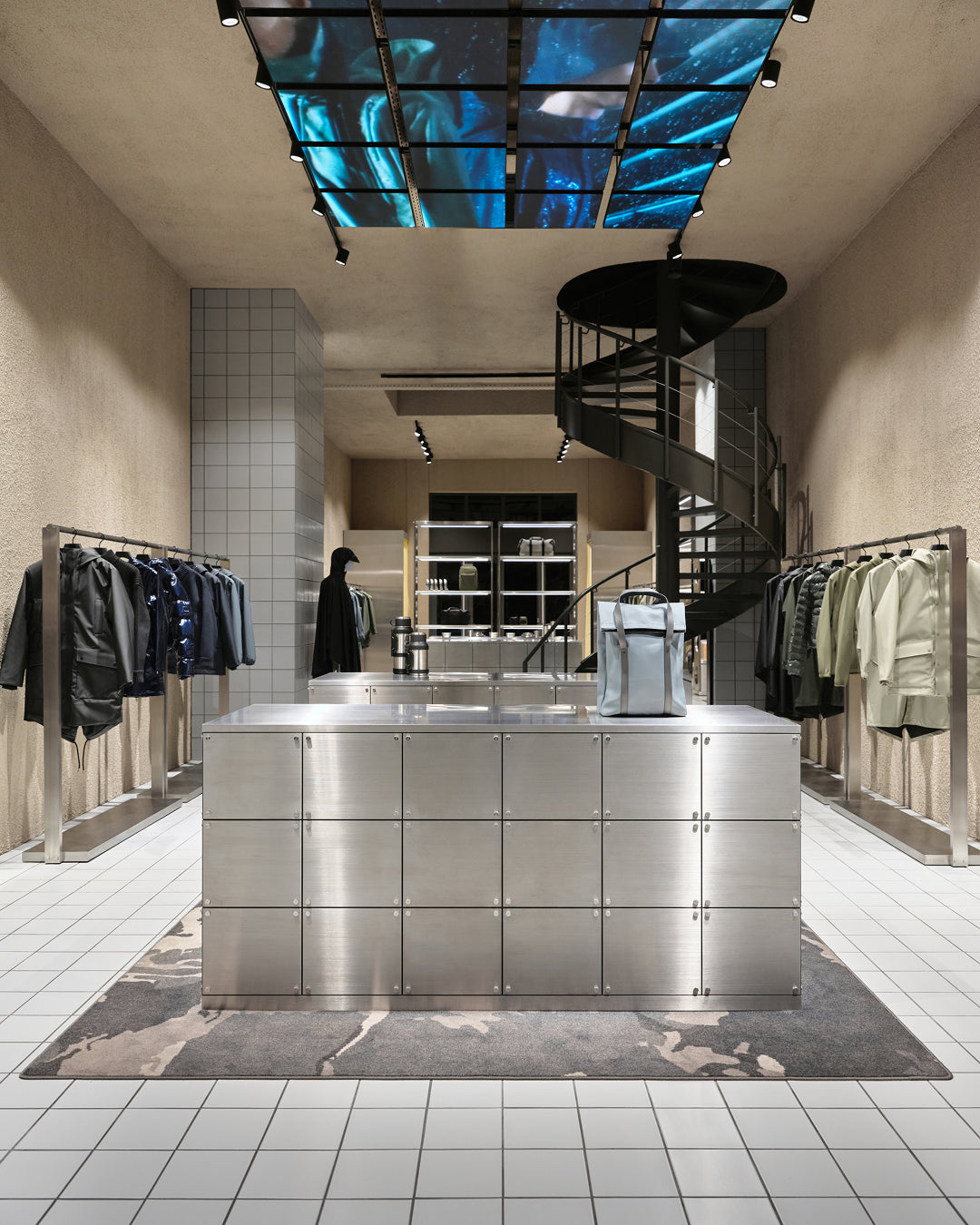 It introduces a whole new look and feel for Rains stores—with a warm, welcoming palette, bespoke furniture, and a balance between futuristic references and the softness of nature.
